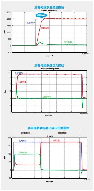 油電伺服系統(tǒng)架構(gòu) 伺服驅(qū)動器從射出成型機控制器獲得壓力及流量命令后,與實際壓力和轉(zhuǎn)速回授進行PID 演算,計算出合適的控制量來驅(qū)動伺服電機與油泵,因此控制系統(tǒng)響應(yīng)快、重復(fù)精度高。