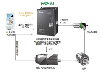 油壓驅(qū)動技術(shù)是目前射出成型機使用最廣泛的驅(qū)動控制方式,具有功率重量比大、壓力和流量控制佳、壽命長及易維護等優(yōu)點;而交流伺服馬達驅(qū)動技術(shù)則具有響應(yīng)快、精度高、恒轉(zhuǎn)矩等優(yōu)點。臺達VFD-VJ系列油電伺服驅(qū)動器利用交流伺服馬達驅(qū)動的油壓系統(tǒng),將伺服驅(qū)動技術(shù)、馬達技術(shù)與油壓技術(shù)結(jié)合,且以精確的壓力與流量控制,消除高壓節(jié)流的能源損耗,將射出成型機油壓驅(qū)動技術(shù)再度創(chuàng)新。此外,臺達在倡導(dǎo)綠色設(shè)計的理念及領(lǐng)先的環(huán)保技術(shù)上,亦提升了產(chǎn)品綠色制造的技術(shù)水平,為客戶創(chuàng)造更多價值。